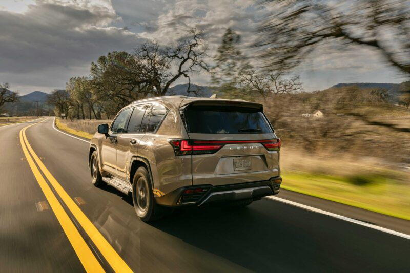 A big footprint, a tall ride height, mushy tires, and an off-road-tuned suspension hurt the LX’s handling, but the 265/70R18 Toyo Open Country A/T III tires that roll over during sharp changes of direction also work in concert with the double-wishbone front suspension, multi-link independent rear suspension, and standard adaptive dampers to soak up even sharp bumps. The LX’s TNGA-F ladder frame platform causes only modest pickup truck-like jiggle on broken pavement.