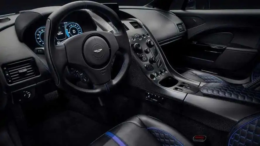 At the rear, the Aston receives a fixed rear spoiler, a new diffuser, and four stacked stainless-steel tailpipes. A titanium system is optional, which increases the volume by 1.5 dB and is 25.8 lighter than the stock exhaust.