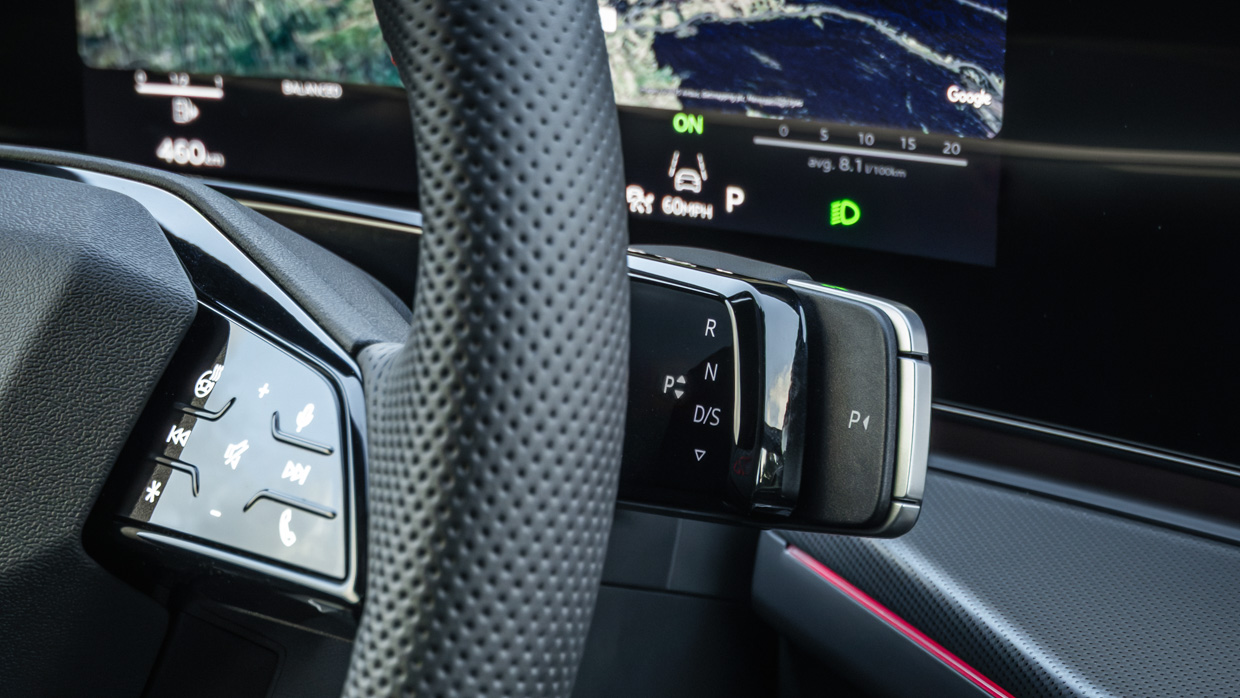 It’s also taken the opportunity to reinvent the mundane stalk with a new, fixed bar which houses an up/down switch for the indicators at one end and gears at the other. The wipers are moved to a neat, circular dial on the left.