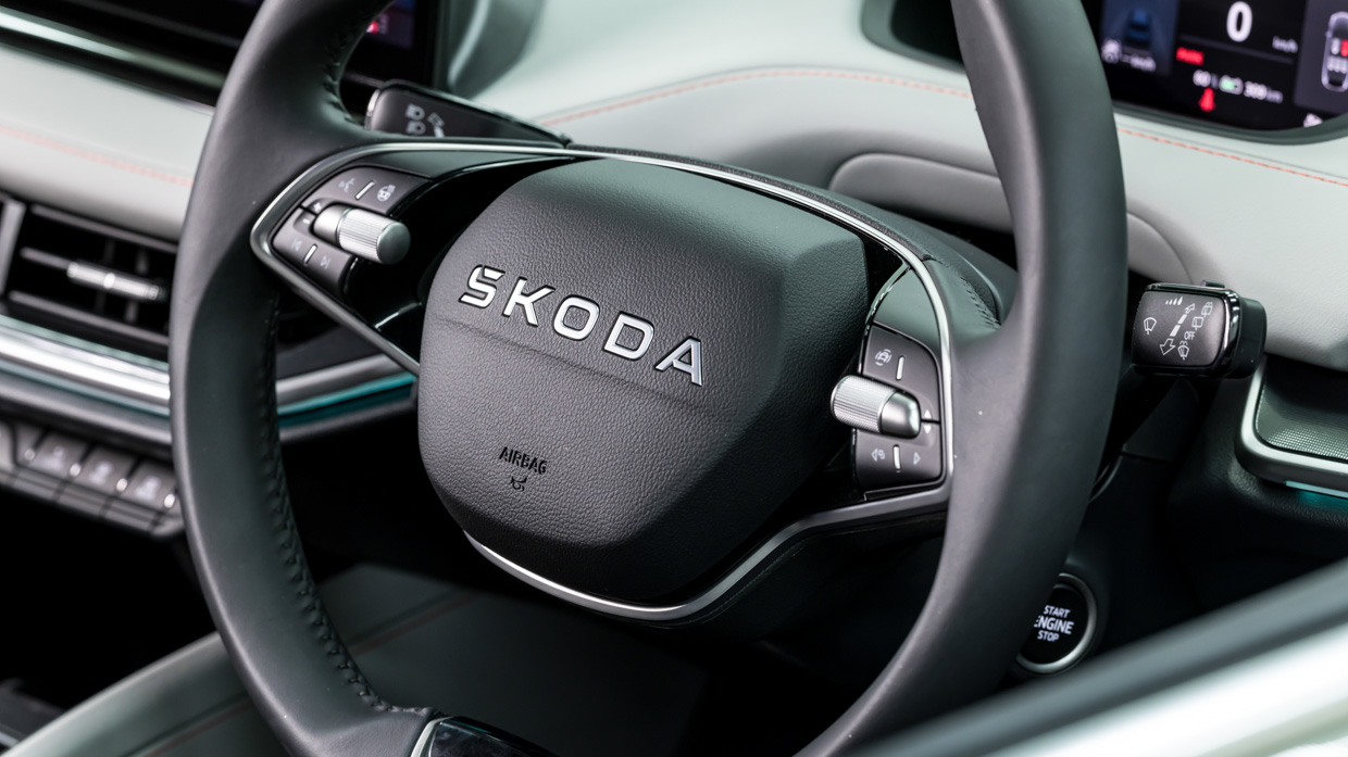 The new look S-K-O-D-A wheel features time-honoured roller controls and frames the digital driver screen that, at just 5.3 inches, looks tiny on paper but is pleasingly simple and useful in use.