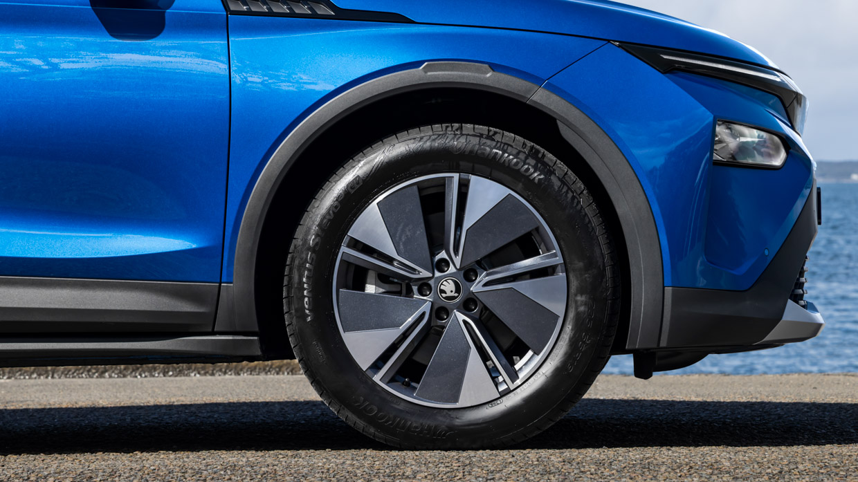 Elroq sits on Volkswagen Group’s now-well-honed MEB platform, with passive strut front and multilink rear suspension and a staggered tyre spec fitting 235mm front and 255mm rears, regardless of whether it’s sat on base 19s or flagship 21s. Like its ID cousins, it’s disc front and drum rear braking.