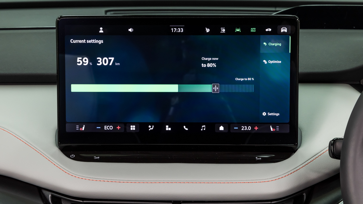 Charging peaks are 11kW for AC and 135kW for DC capacities, with Skoda quoting eight hours for AC (0-100 percent) and approximately 28 minutes for the 10 to 80 percent DC recharge.